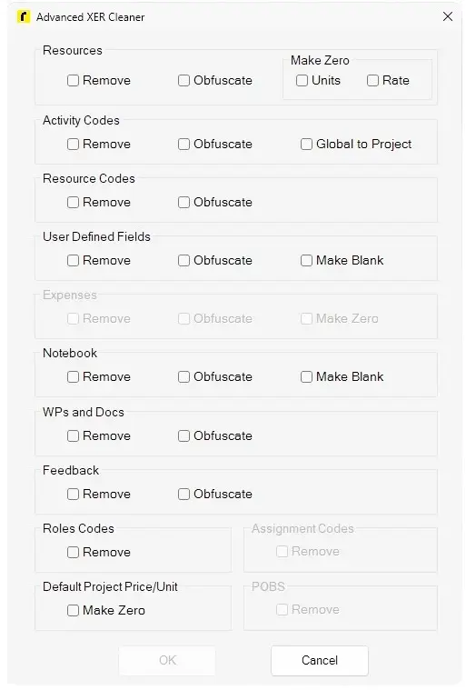Sanitise and anonymise Primavera P6 XER files before sharing them with clients, contractors, or third parties — without opening P6. The Advanced XER Cleaner gives you granular control over exactly what data stays and what gets removed or obfuscated.